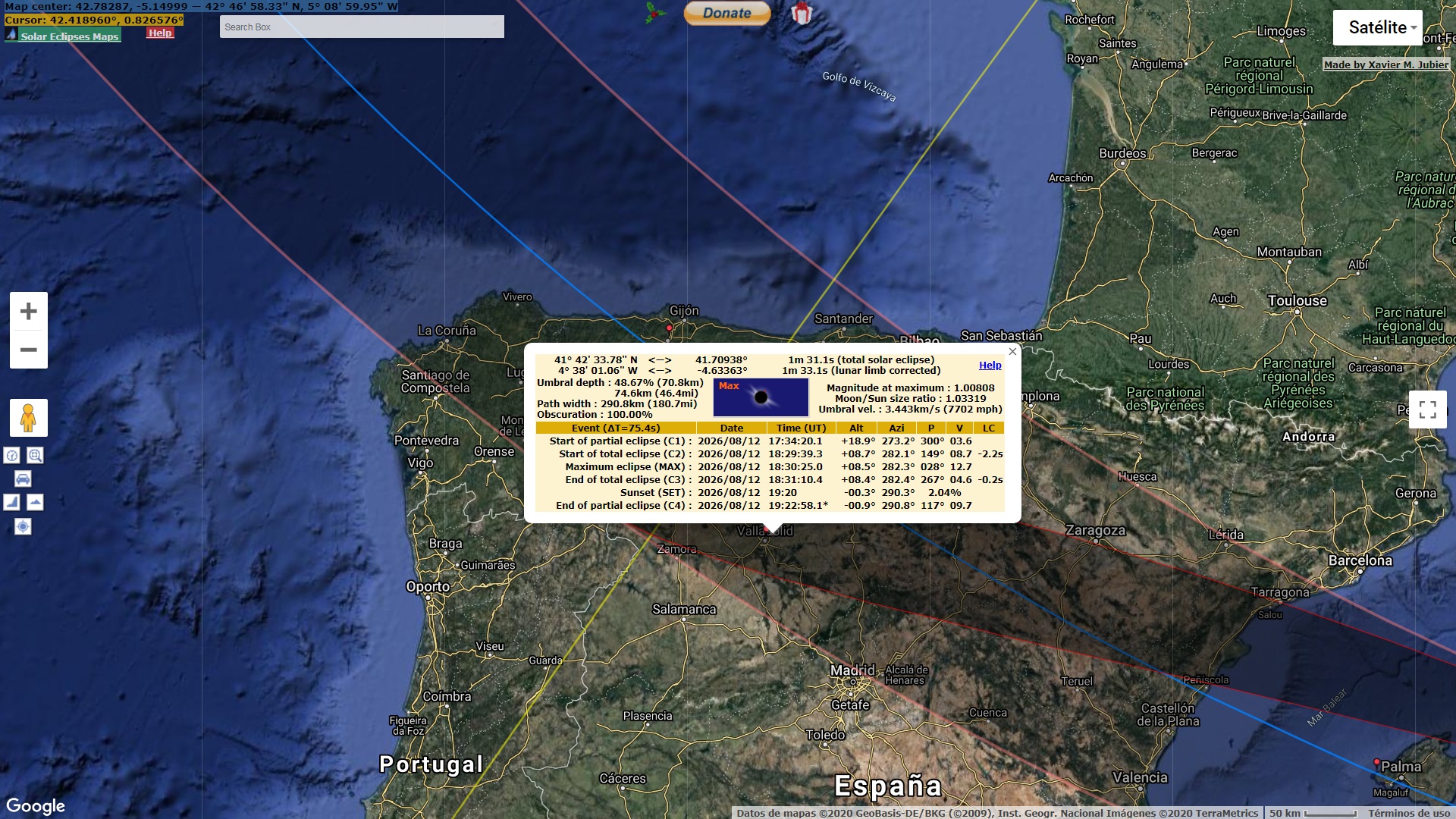 Se puede observar en el informe de la derecha el eclipse total de Sol España 12 Agosto 2026.