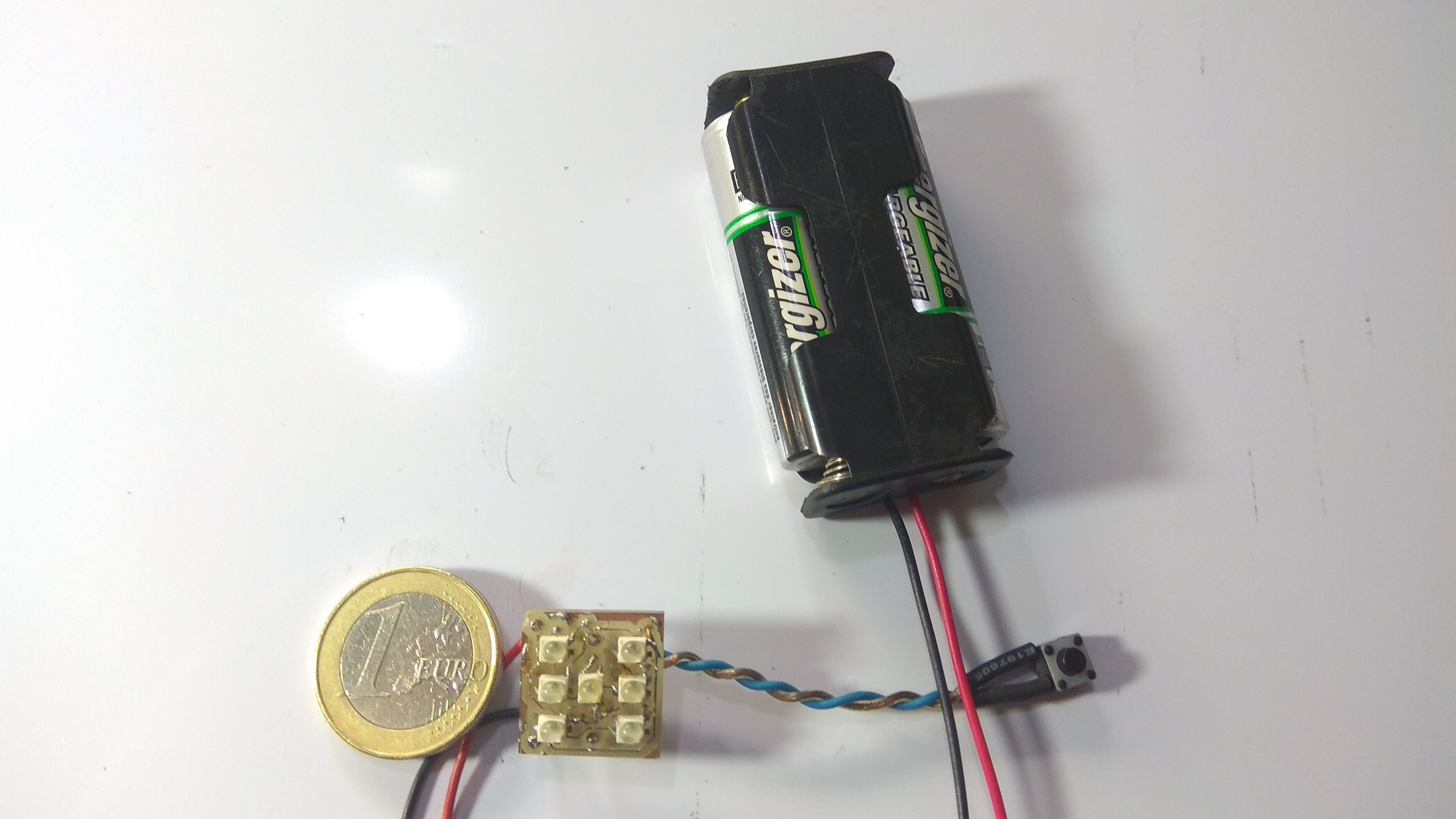 Mi idea era reducir el tamaño de mi anterior dado electrónico a la mínima expresión. Para ello he diseñado el PCB de modo que tanto la alimentación como el pulsador queden fuera de la placa conectados con sendos pares de cables.