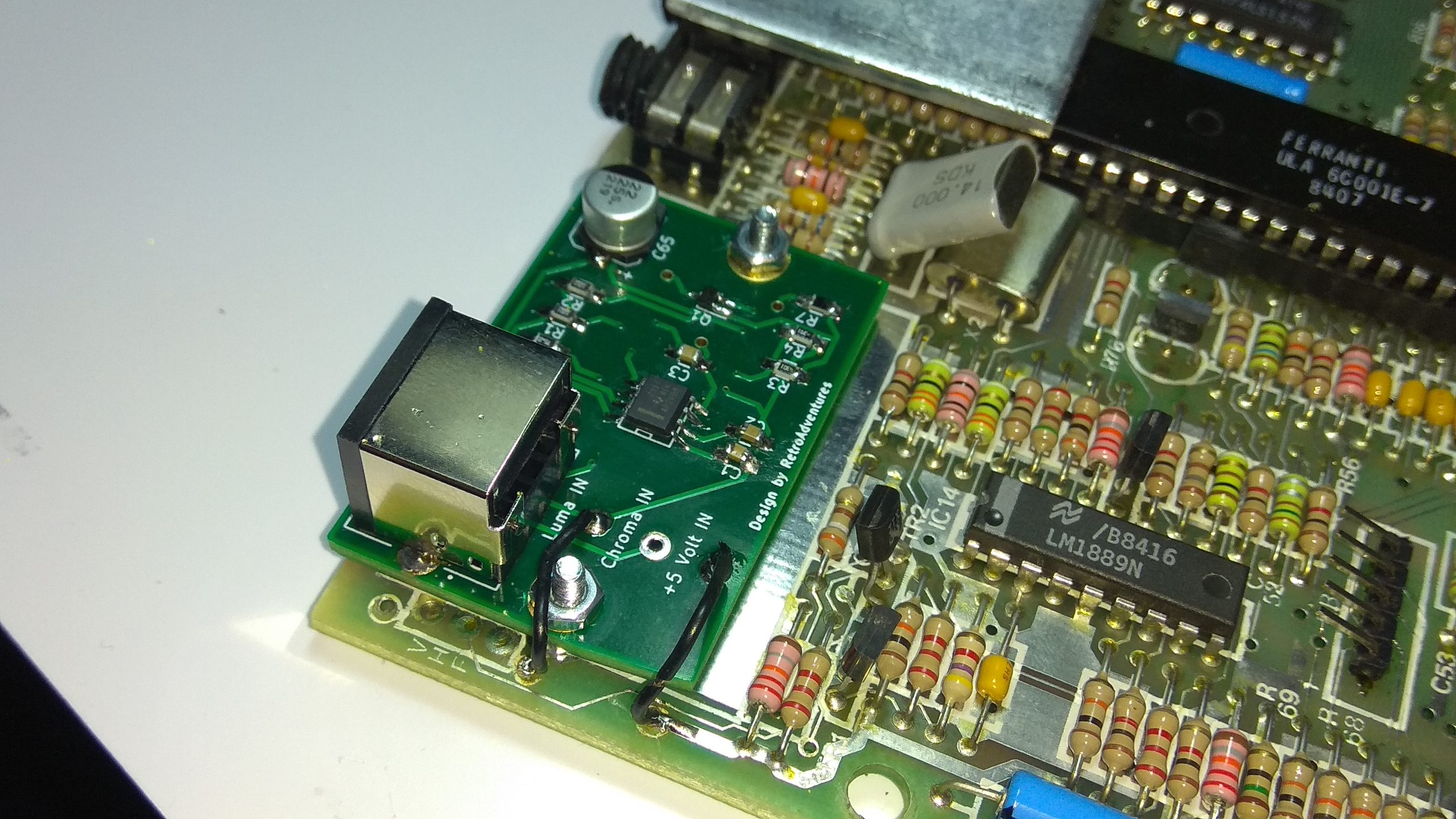 El día que hice el montaje en previsión de iba a usar este circuito en 3 Spectrums compré 3 cables S-VHS y 3 adaptadores de S-video a Scart 21 y me han llegado hoy 8 de Enero 2021; pues con ellos me he ido a probarlos en el Speccy modificado; !Y.. sorpresa!! al usar ambos el color apareció en pantalla. Intercambié tanto el cable como el adaptador por los elementos viejos que usé el primer día, y he llegado a la conclusión de que el cable usado el primer día no está bien. Ante la duda de que faltase continuidad en la señal de croma, he comprobado pin a pin ambos extremos del cable antiguo y parece OK. No se hay alguna diferencia en las calidades, espesores de cobre etc. La única diferencia que veo es la longitud del cable; el viejo medía unos 120 cm y el nuevo 300.